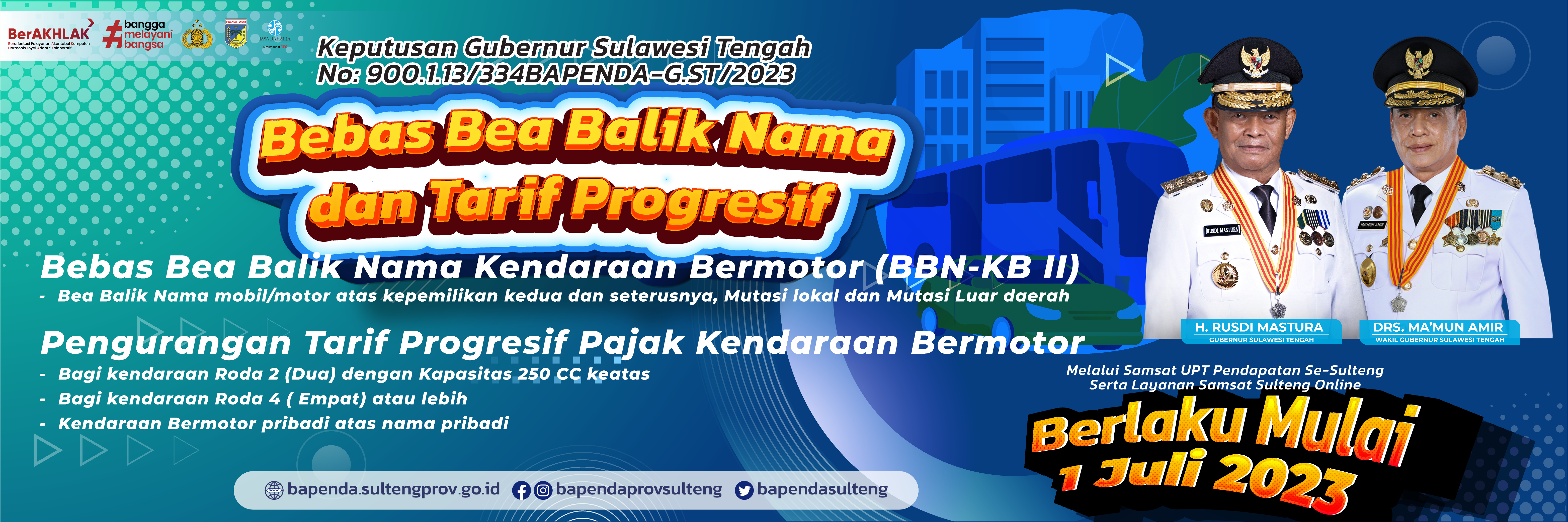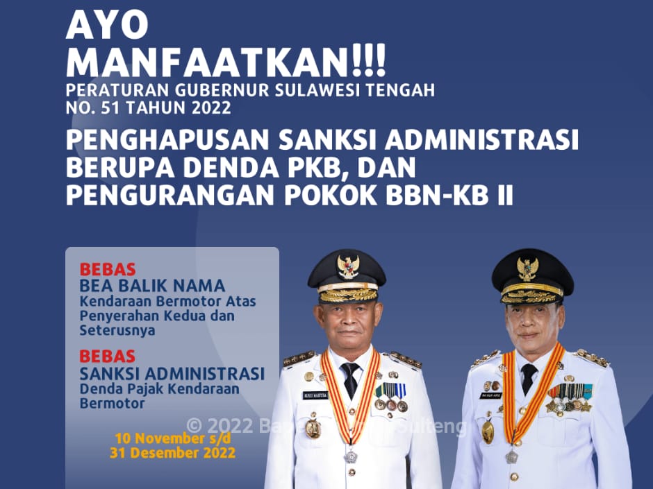 Pemerintah Provinsi Sulawesi Tengah melalui Badan Pendapatan Daerah Provinsi Sulawesi Tengah menghadirkan Program Penghapusan Sanksi Administrasi Berupa Denda PKB dan Pengurangan BBN-2 Kendaraan Bermotor terhitung 10 November hingga 31 Desember 2022.