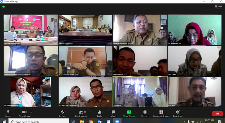 Kepala Badan Pendapatan Daerah Provinsi Sulawesi Tengah, Rifki Anata Mustaim mengawali kerja diawal tahun 2023 melaksanakan pertemuan secara daring melalui aplikasi video meeting Zoom dengan UPT Pendapatan se-Sulawesi Tengah. Dihadiri oleh Pejabat dilingkup Bapenda, pertemuan daring yang dilaksanakan dari Ruang Kepala Badan tersebut bertujuan untuk mengevaluasi kinerja selama tahun 2022 yang telah dilalui serta membahas perencanaan-perencanaan untuk tahun 2023 kedepan.