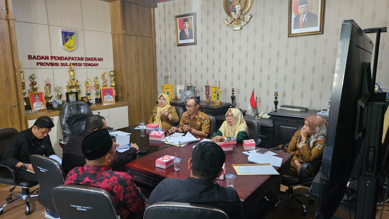 (02/01) Kepala Badan Pendapatan Daerah Rifki Anata Mustaqim didampingi Sekretaris Badan Muh. Nur dan para Kepala Bidang menerima kunjungan Tim Sidak awal tahun 2025 yang dipimpin oleh Kepala Biro Hukum Setda Prov. Sulteng, Adiman, bertempat di Ruang Rapat Sekretaris Badan.